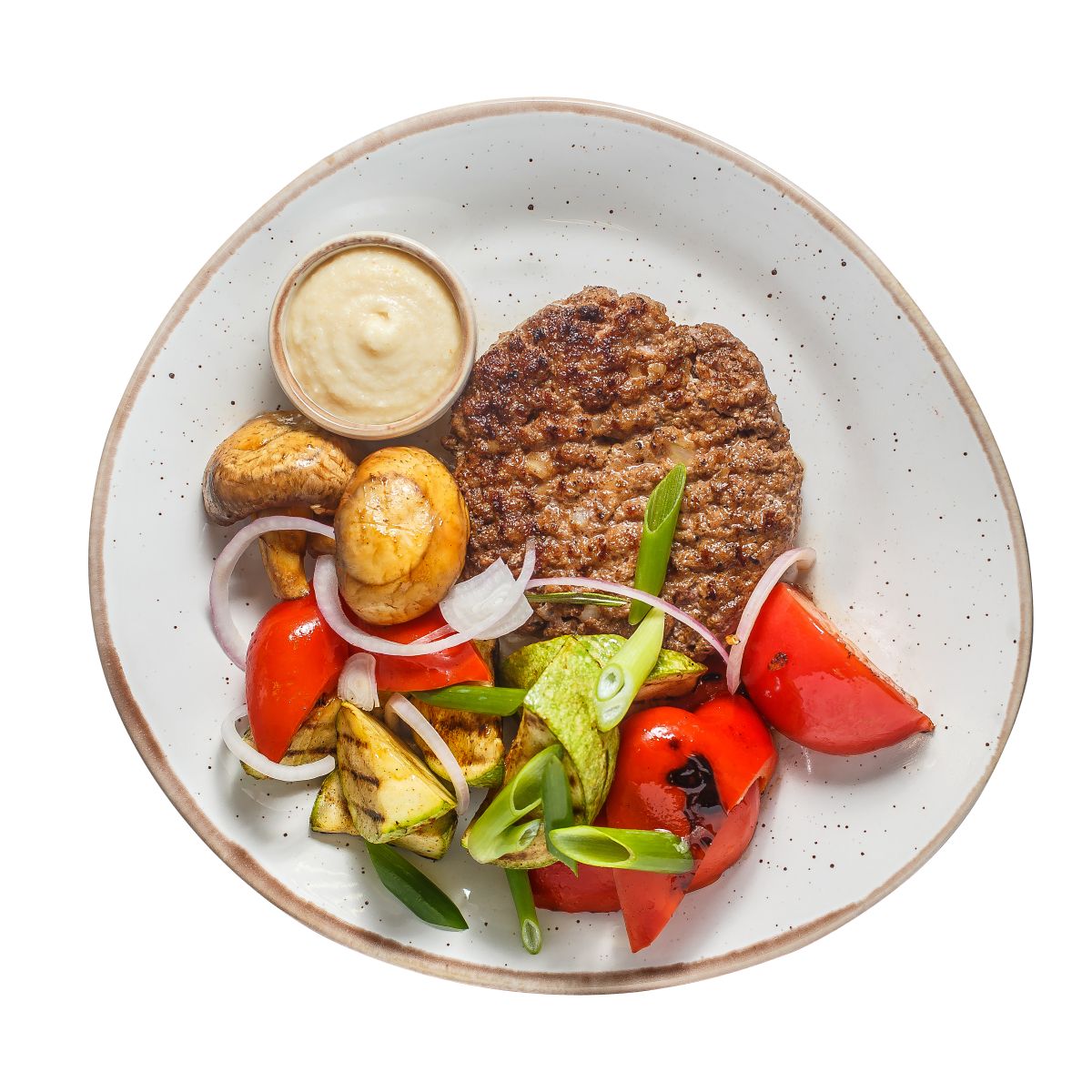 Бифштекс из мраморной говядины (Сочные рубленые котлеты, подаются с печенными овощами с соусом из хрена)
