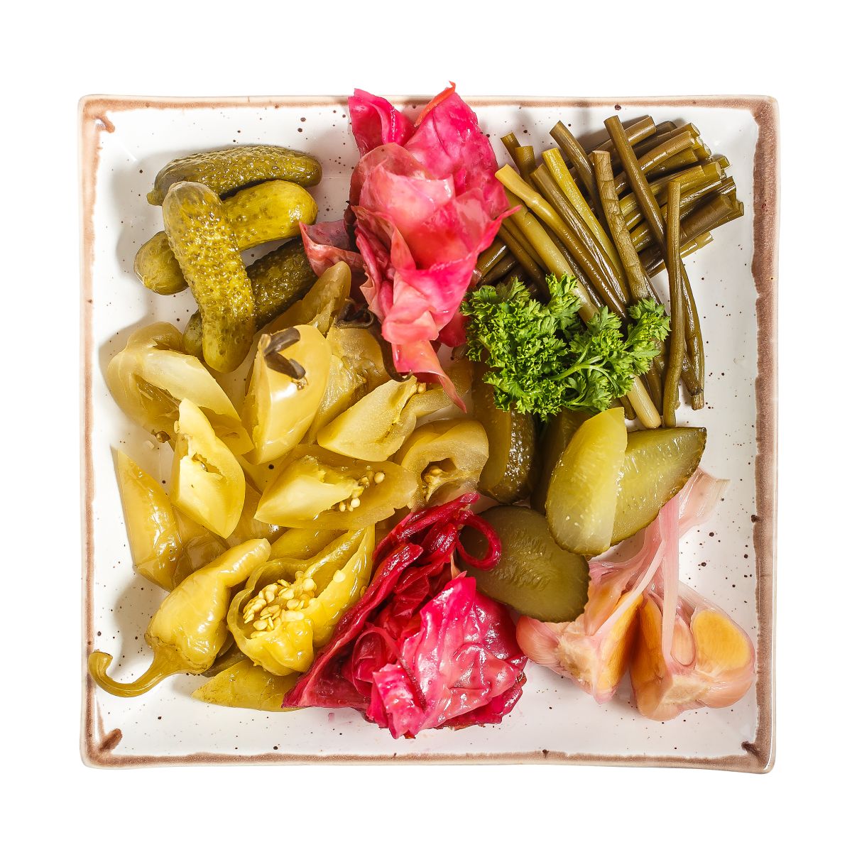 Домашний разносол (Гурийская капуста, огурцы соленые, помидоры соленые, чеснок маринованный, черемша, перец соленый)