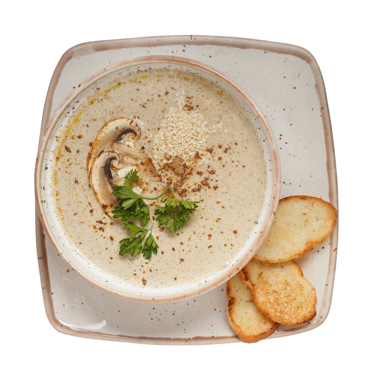 Грибной крем-суп из шампиньонов со сливками (подается с гренками из белого хлеба и зеленью)