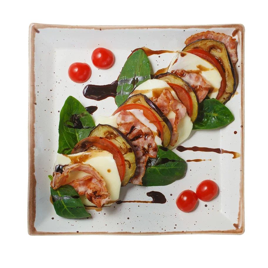 Легкая закуска из томатов, моцареллы, жареного баклажана, бекона, шпината, бальзамического соуса
