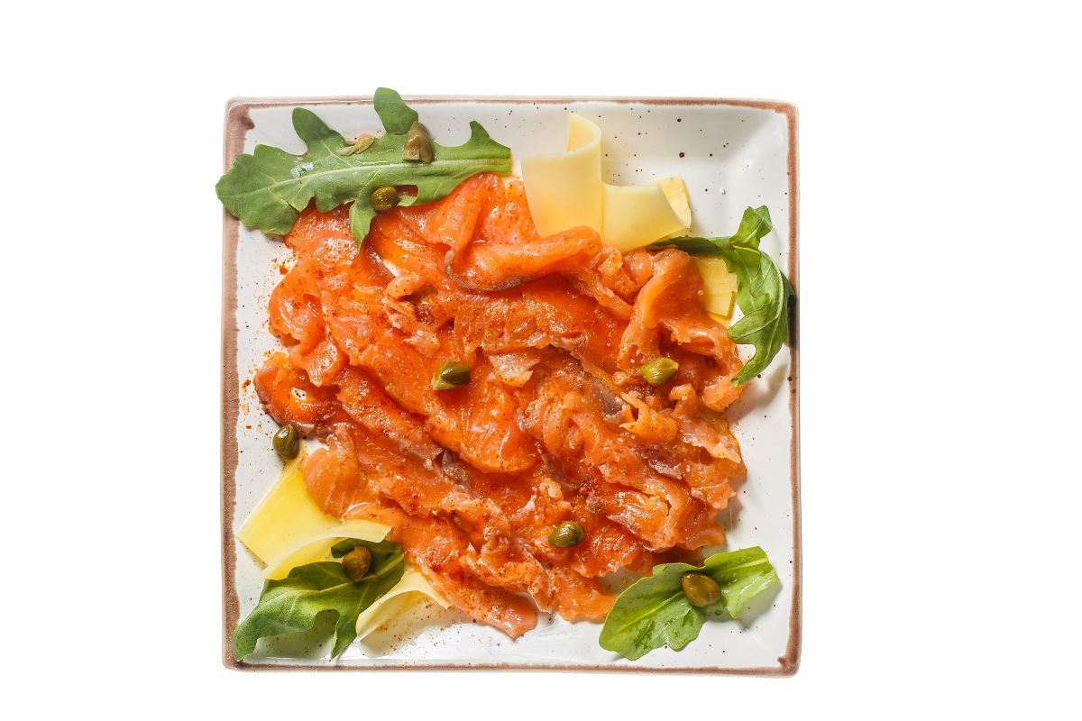 Карпаччо из лосося (ломтики сырого лосося, с заправкой из оливкового масла, сока лимона и специи, подается с пармезаном руколой, каперсами)
