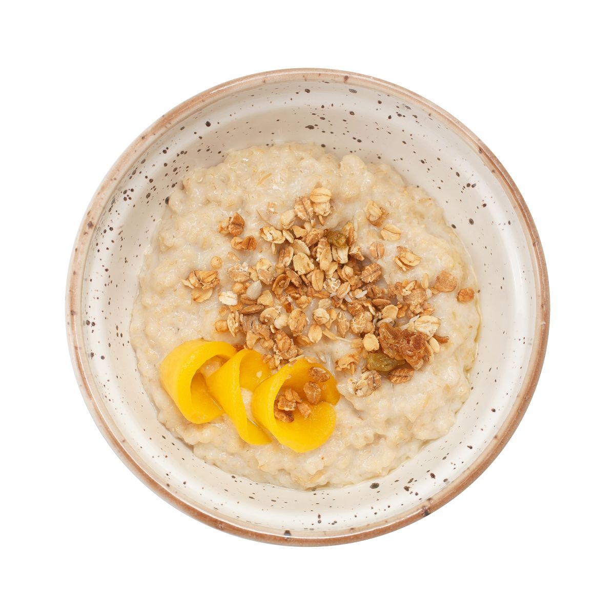 Подается с консервированным персиком и запеченными мюсли