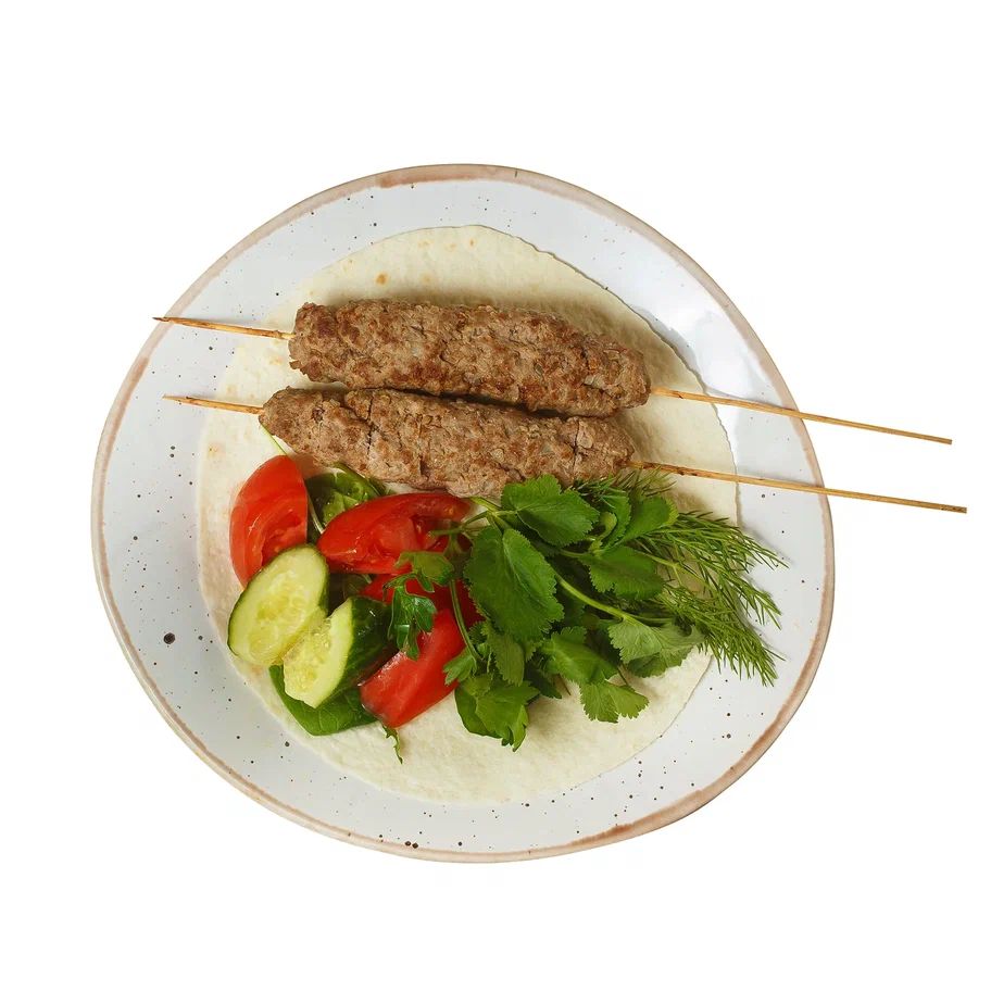 Из мяса говядины со специями подается на лаваше со свежим овощным салатом и кинзой