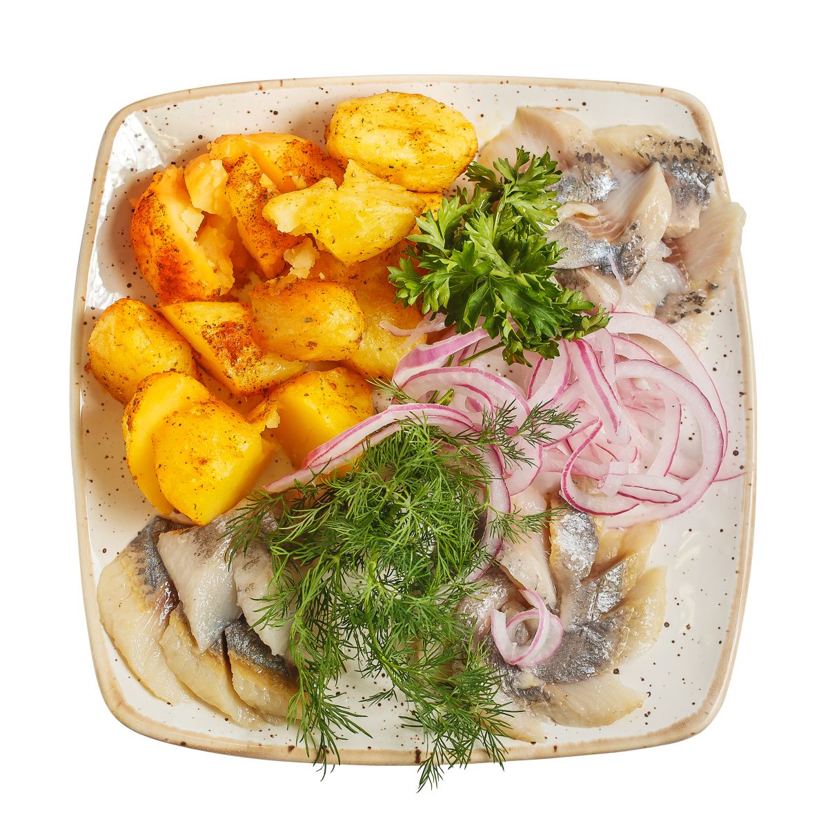 Сельдь слабосоленая с запеченым картофелем (подается с жареным черным чесночным хлебом, красным луком и молосольными огурчиками)