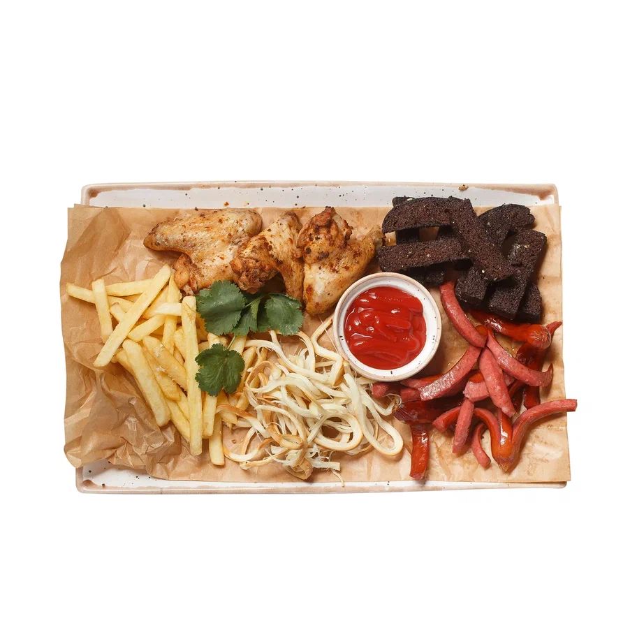 Гренки чесночные, фри, сулугуни чечил копченый, крылышки жареные, охотничьи колбаски, соус томатный