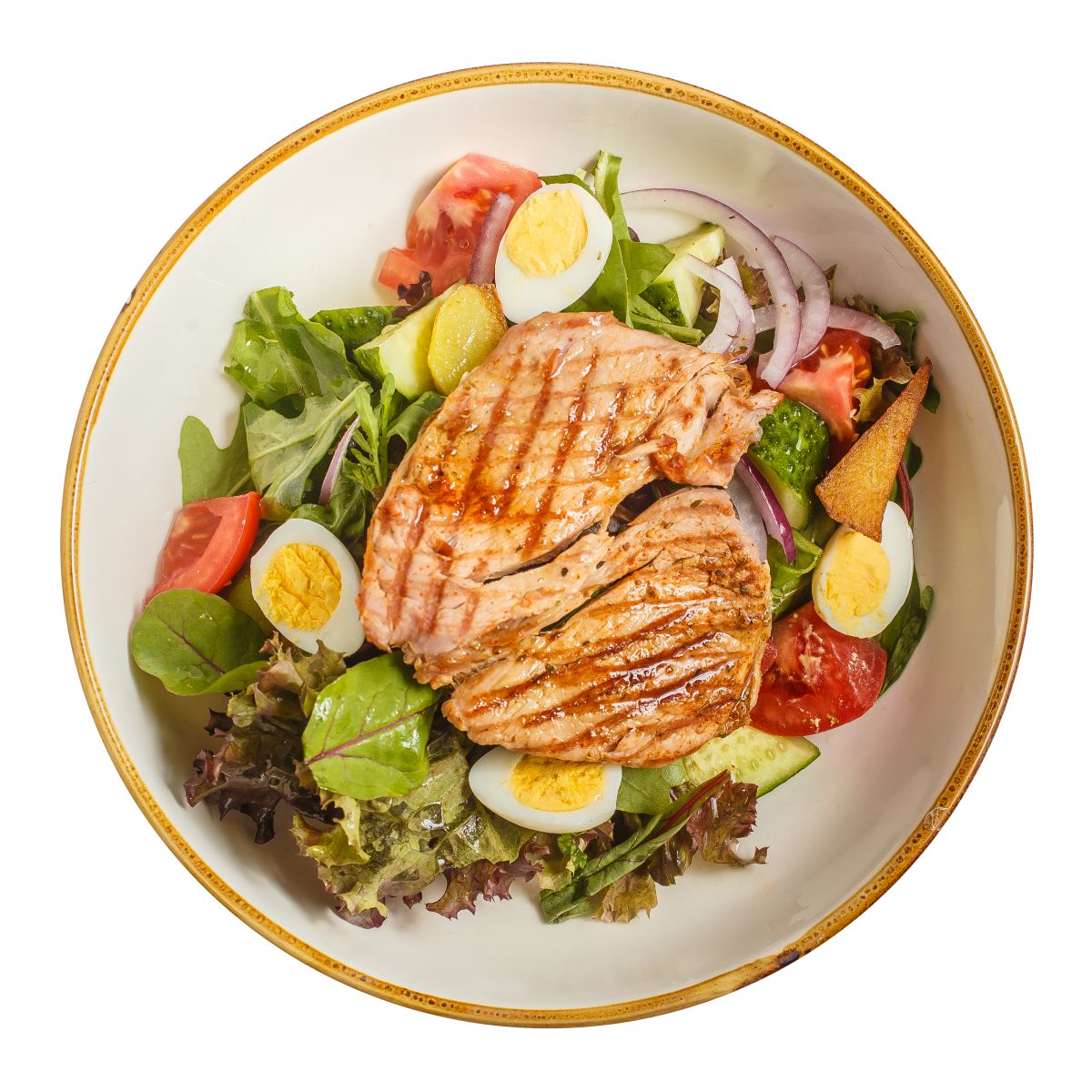 Стейк салат (филе свинины, микс зелени, огурец свежий, черри, обжаренный картофель, яйцо перепелиное, фирменная заправка)