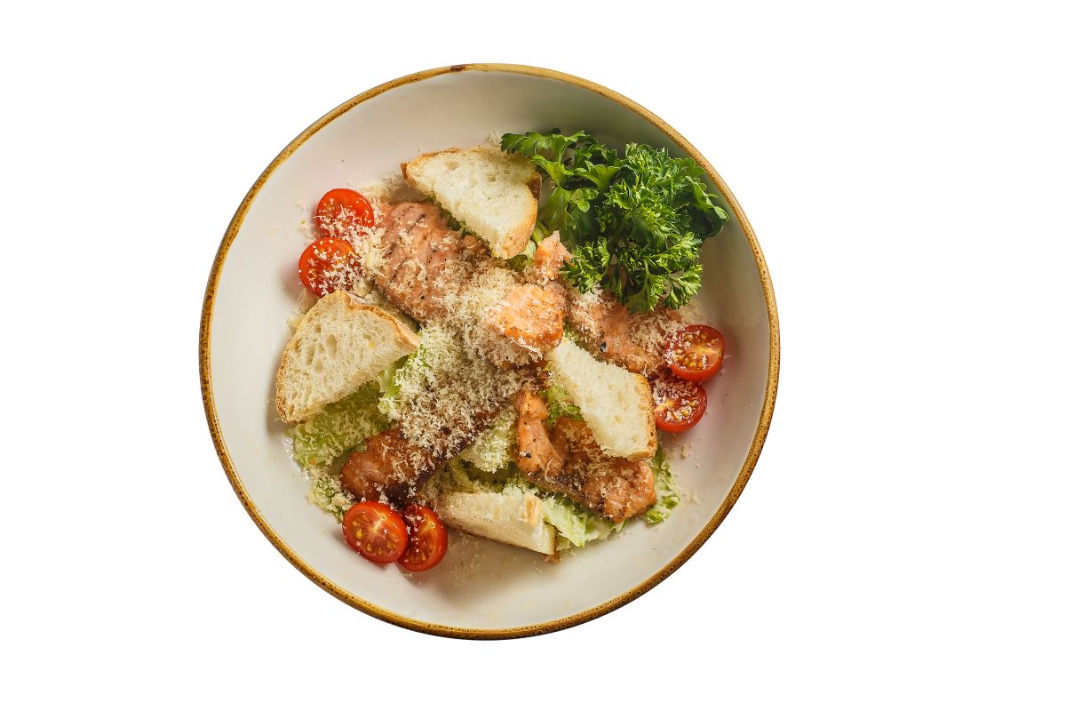 Салат Цезарь с лососем-гриль (хрустящий салат, ароматные гренки, теплый лосось, сыр пармезан, помидорки черри, заправка)